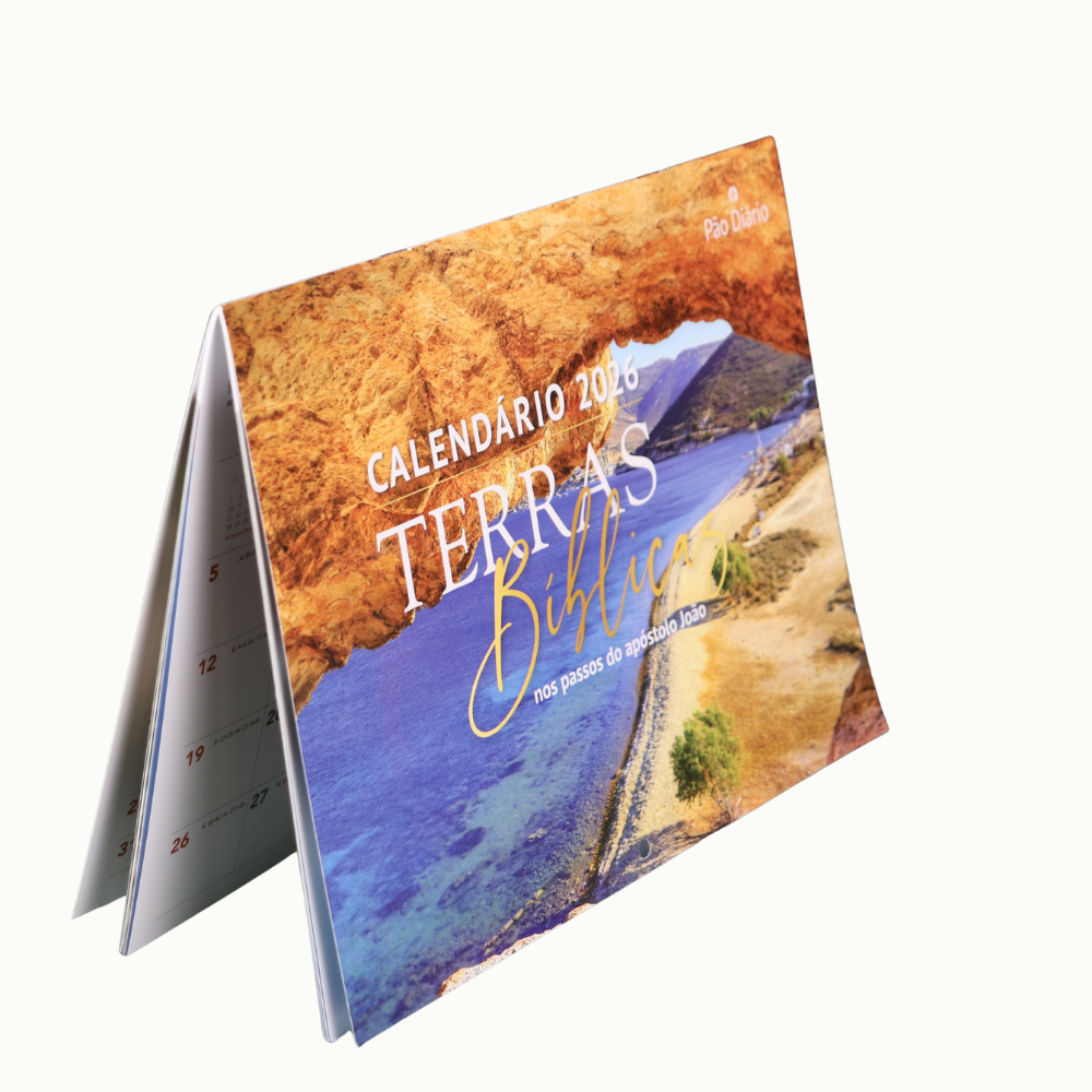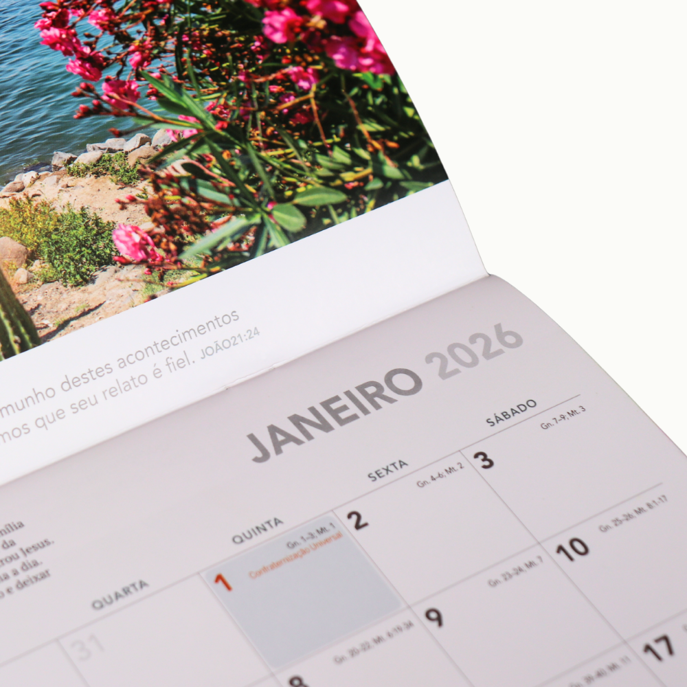 Com três opções de capa — Terras Bíblicas, Flores e Paisagens —, cada mês apresenta imagens deslumbrantes acompanhadas de versículos cuidadosamente escolhidos para fortalecer a fé e embelezar o ambiente.